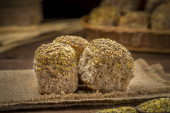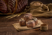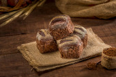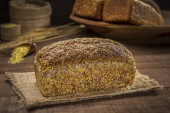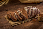 chleb pełnoziarnisty na wiejskim drewnianym stole.