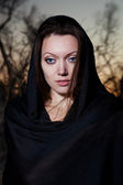 piękna młoda kobieta z ciemnoszarą chustą na głowie pokrywa twarz luksusowym makijażem na czarnym tle patrząc w dół