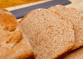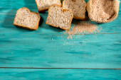 plasterki całego chleba na teksturowanym niebieskim drewnie