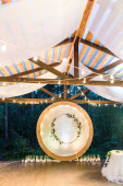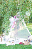 Kolorowe wigwam z zabawkami, balonami i tortem na łonie natury