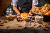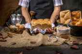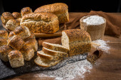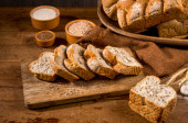 piekarz krojący chleb zbożowy na rustykalnym stole