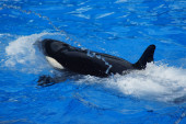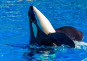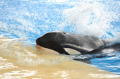 Wyszkoleni wieloryby czarno-białe orki występują w niebieskim basenie przed turystami na pokazach wodnych