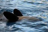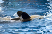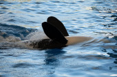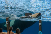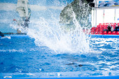 Loro park, Puerto de la Cruz, Teneryfa, Wyspy Kanaryjskie, Hiszpania, 16 grudnia 2021. Wyszkoleni wieloryby czarno-białe orki występują przed turystami na pokazach wodnych.