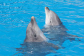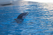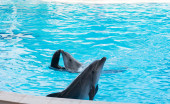 Wyszkolone zwierzęta morskie delfiny działają w niebieskim basenie przed turystami na pokazach wodnych