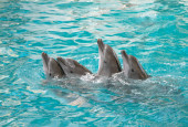 Zdjęcie "Wyszkolone zwierzęta morskie delfiny działają w niebieskim basenie przed turystami na pokazach wodnych" może być wykorzystywane do celów osobistych i komercyjnych zgodnie z warunkami zakupionej licencji Royalty-free. Obraz jest dostępny do pobrania w jakości wysokiej rozdzielczości do 5760x3840.
