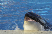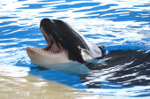 Loro park, Puerto de la Cruz, Teneryfa, Wyspy Kanaryjskie, Hiszpania, 16 grudnia 2021. Wyszkoleni wieloryby czarno-białe orki występują przed turystami na pokazach wodnych.