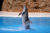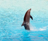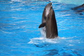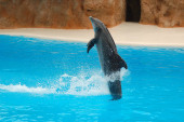 Puerto de la Cruz, Teneryfa, Wyspy Kanaryjskie, Hiszpania, 16 grudnia 2021. Grupa wyszkolonych delfinów występuje w basenie przed turystami na pokazach wodnych
