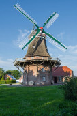 Zdjęcie "Młyn Nenndorf we wschodniej Fryzji został zbudowany w 1850 roku. Galeria Holender spłonął w 1872 roku i został przebudowany na dwóch piętrach." może być wykorzystywane do celów osobistych i komercyjnych zgodnie z warunkami zakupionej licencji Royalty-free. Obraz jest dostępny do pobrania w jakości wysokiej rozdzielczości do 5760x3840.