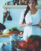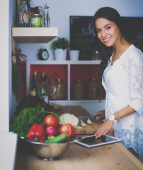 Zdjęcie "Młoda kobieta kroi warzywa w kuchni przy biurku." może być wykorzystywane do celów osobistych i komercyjnych zgodnie z warunkami zakupionej licencji Royalty-free. Obraz jest dostępny do pobrania w jakości wysokiej rozdzielczości do 5760x3840.