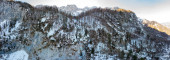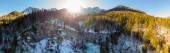 Zdjęcie "Spektakularna panorama gór z wodospadem przechodzącym przez las." może być wykorzystywane do celów osobistych i komercyjnych zgodnie z warunkami zakupionej licencji Royalty-free. Obraz jest dostępny do pobrania w jakości wysokiej rozdzielczości do 5760x3840.