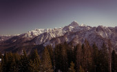 Spektakularna panorama gór z wodospadem przechodzącym przez las.