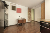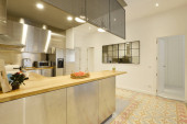 Białe szafki kuchenne z drewnianym blatem i stołem jadalnym w tle