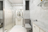 Zdjęcie "Toaleta wyłożona płytkami hydraulicznymi na jednej ścianie i podłodze oraz inna z podobną białą cegłą" może być wykorzystywane do celów osobistych i komercyjnych zgodnie z warunkami zakupionej licencji Royalty-free. Obraz jest dostępny do pobrania w jakości wysokiej rozdzielczości do 5760x3840.