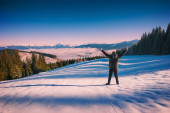 Wędrowiec dla dorosłych kobiet na szczycie góry Hollyburn o zachodzie słońca w sezonie zimowym