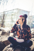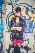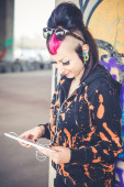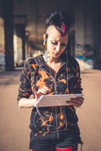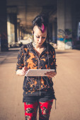 młody piękny punk dziewczyna ciemny używania tabletu