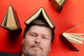 Dorosły mężczyzna przewraca oczami i patrzy w sufit. Zdekoncentrowany kawałek papieru do pakowania na pierwszym planie. W środku. Skupienie selektywne.