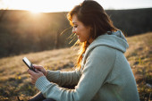 Zdjęcie "Cute kobieta czyta przyjemne wiadomości tekstowe na telefon komórkowy podczas siedzenia w parku, wspaniały kobieta słucha muzyki i wyszukiwanie informacji na telefon komórkowy" może być wykorzystywane do celów osobistych i komercyjnych zgodnie z warunkami zakupionej licencji Royalty-free. Obraz jest dostępny do pobrania w jakości wysokiej rozdzielczości do 5760x3840.