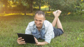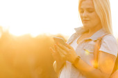 Cute kobieta czyta przyjemne wiadomości tekstowe na telefon komórkowy podczas siedzenia w parku, wspaniały kobieta słucha muzyki i wyszukiwanie informacji na telefon komórkowy