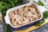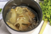 Wypłukać kości w zimnej wodzie i przenieść do rondla. Dodać dokładnie umytą nieobraną cebulę, pokrojoną marchewkę, liście laurowe i paprykę. Wlać wodę, włożyć do pieca i doprowadzić zawartość do wrzenia.