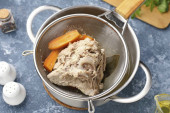 Zdjęcie "Wypłukać kości w zimnej wodzie i przenieść do rondla. Dodać dokładnie umytą nieobraną cebulę, pokrojoną marchewkę, liście laurowe i paprykę. Wlać wodę, włożyć do pieca i doprowadzić zawartość do wrzenia." może być wykorzystywane do celów osobistych i komercyjnych zgodnie z warunkami zakupionej licencji Royalty-free. Obraz jest dostępny do pobrania w jakości wysokiej rozdzielczości do 5760x3840.