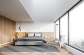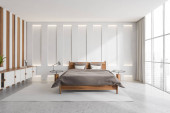 Zdjęcie "Jasne wnętrze sypialni z łóżkiem, panoramiczne okno z widokiem na miasto, białe ściany, drewniana ściana działowa, betonowa podłoga, książki i łóżka. Koncepcja współczesnego projektowania apartamentów. 3d renderowanie" może być wykorzystywane do celów osobistych i komercyjnych zgodnie z warunkami zakupionej licencji Royalty-free. Obraz jest dostępny do pobrania w jakości wysokiej rozdzielczości do 5760x3840.