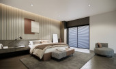 Zdjęcie "Jasne wnętrze sypialni z łóżkiem, panoramiczne okno z zasłoną, białe ściany, drewniana ściana działowa, betonowa podłoga, zeszyty i nocnik. Koncepcja współczesnego projektowania apartamentów. 3d renderowanie" może być wykorzystywane do celów osobistych i komercyjnych zgodnie z warunkami zakupionej licencji Royalty-free. Obraz jest dostępny do pobrania w jakości wysokiej rozdzielczości do 5760x3840.