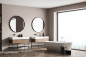 Zdjęcie "Białe wnętrze pokoju kąpielowego z wanną na podium i umywalką z lustrem, bocznym widokiem, szarą betonową podłogą. Panoramiczne okno z widokiem na okolicę. Renderowanie 3D" może być wykorzystywane do celów osobistych i komercyjnych zgodnie z warunkami zakupionej licencji Royalty-free. Obraz jest dostępny do pobrania w jakości wysokiej rozdzielczości do 5760x3840.