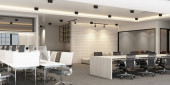 Widok rogu na jasne wnętrze kawiarni ze stołami z krzesłami, białą ścianą, łukiem i betonową podłogą. Koncepcja minimalistycznego designu. Miejsce na kreatywny pomysł. 3d renderowanie