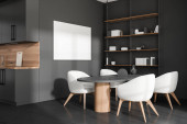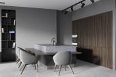 Zdjęcie "Białe wnętrze kuchni z czterema fotelami i blatem na szarej posadzce, widok z boku. Półka z książkami, reflektory. Kuchnia z nowoczesnym sprzętem. Renderowanie 3D" może być wykorzystywane do celów osobistych i komercyjnych zgodnie z warunkami zakupionej licencji Royalty-free. Obraz jest dostępny do pobrania w jakości wysokiej rozdzielczości do 5760x3840.