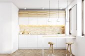 Zdjęcie "Jasne wnętrze kuchni z krzesłami i stół jadalny z naczyniami, drewniana podłoga. Zestaw do gotowania w pobliżu panoramicznego okna z widokiem na okolicę, renderowanie 3D" może być wykorzystywane do celów osobistych i komercyjnych zgodnie z warunkami zakupionej licencji Royalty-free. Obraz jest dostępny do pobrania w jakości wysokiej rozdzielczości do 5760x3840.