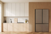 Zdjęcie "Drewniane wnętrze kuchenne z szafką i zlewem, ręcznik i płyta na pokładzie, kuchenka i piekarnik, półki z naczyniami kuchennymi, podłoga z drewna liściastego. Luksusowa kuchnia z nowoczesnymi meblami, renderowanie 3D" może być wykorzystywane do celów osobistych i komercyjnych zgodnie z warunkami zakupionej licencji Royalty-free. Obraz jest dostępny do pobrania w jakości wysokiej rozdzielczości do 5760x3840.