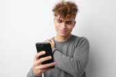 perwersyjny facet z telefonem w ręcznej komunikacji odizolowane tło