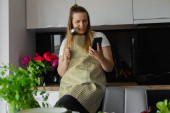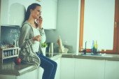 Zdjęcie "Portret młodej uśmiechniętej blondynki trzymającej filiżankę kawy. Rozmowa na smartfonie o pracy w biznesie." może być wykorzystywane do celów osobistych i komercyjnych zgodnie z warunkami zakupionej licencji Royalty-free. Obraz jest dostępny do pobrania w jakości wysokiej rozdzielczości do 5760x3840.