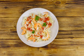 Makaron spaghetti z krewetkami, sosem pomidorowym i pietruszką na drewnianym stole
