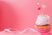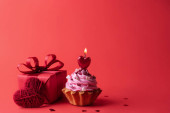 ciasto z bitą śmietaną z czerwoną świecą w postaci serca na fioletowym tle. Walentynki i koncepcja urodzin