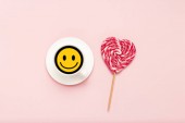 żółte emotki ciasto z małymi sercami na fioletowym tle. Walentynki i koncepcja urodzin