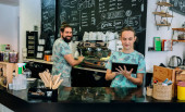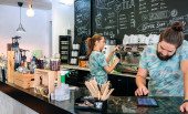 Matka rysunek z córką, podczas gdy ojciec pracuje w ich własnej kawiarni