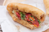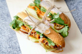 Baguette Azji fusion wegańskie kanapka z fermentowane i świeże warzywa na teksturowanym białym