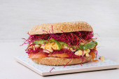 Azjatyckie fuzyjne wegańskie miękkie bułki z bezmięsnym ciecierzycy burger, marchew, cukinia, majonez, chrupiące orzeszki ziemne i zielone liście rakiety