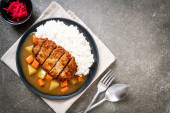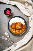 Azjatyckie wegańskie mięso bez ciecierzycy, ozdobione marchewką, cukinią i miękkim białym ryżem