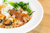 Azjatycki wegańskie mięso-free makaron ramen z grzybami, sfermentowane tofu, kiełk, fasola, wegańskie jajko i zielone liście pak choi