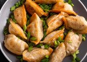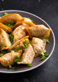 Azji fuzja wegańskie mięso-free pierogi ze słodkim sosem sezamowym na niebieski i fioletowy