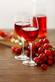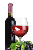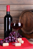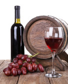 Czerwone wino w czara, winogron i beczki na drewnianym stole na białym tle