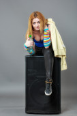 Piękna brunetka w różowym stroju ciała retro z kucykiem fryzury, hula hoop i butelki wody w ręku. Na zewnątrz
