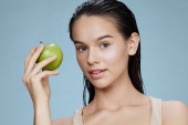 Zdjęcie "Idea zdrowego odżywiania. Doskonała brunetka z zielonym jabłkiem" może być wykorzystywane do celów osobistych i komercyjnych zgodnie z warunkami zakupionej licencji Royalty-free. Obraz jest dostępny do pobrania w jakości wysokiej rozdzielczości do 5760x3840.