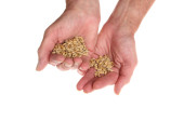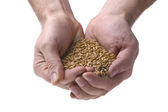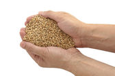 surowa gryka w dłoniach na białym, izolowanym tle