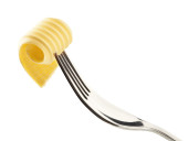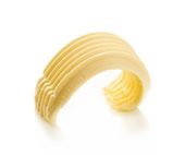 curl świeżego masła na nożu izolowanym na białym tle