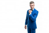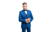 dojrzały mężczyzna w muszce niebieski garnitur. Biznesmen odizolowany na białym. Wielki szef w formalnym stroju. przestrzeń kopiowania