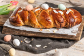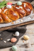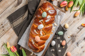 Portugalski tort wielkanocny. Folar z jajkami na stole wielkanocnym. Tulipany kwitnące, kolorowe malowane jaja i pióra