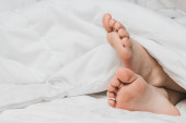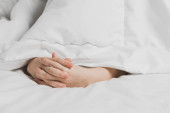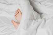 Childs nogi pokryte są białą pościelą. Ciepło domowego komfortu